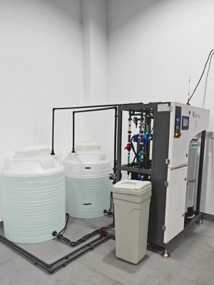 江蘇宇科能源科技在鋰電池材料研發(fā)、儲(chǔ)能設(shè)備制造等關(guān)鍵生產(chǎn)環(huán)節(jié)對工藝用水有著嚴(yán)格要求。針對新能源行業(yè)對水質(zhì)純度和水量的雙重需求,滲源科技設(shè)計(jì)的SYRO-500L系統(tǒng)采用"多介質(zhì)過濾+反滲透"組合工藝,產(chǎn)水電導(dǎo)率穩(wěn)定達(dá)到≤5μS/cm(在線監(jiān)測),微生物≤1cfu/ml,微顆粒物≤1個(gè)/ml,完全滿足電極材料制備、電池組件清洗等工藝的用水需求。