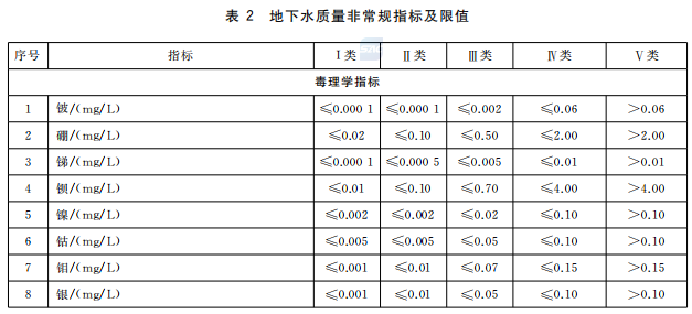 地下水質(zhì)量指標(biāo)分為常規(guī)指標(biāo)和非常規(guī)指標(biāo),其分類及限值分別見表1和表2。