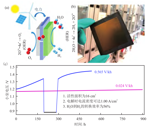 SOEC電解水機(jī)理示意圖(a)、SOEC極板照片(b)和750℃、1.00 A/cm²電流密度下,SOEC長(zhǎng)時(shí)間電解電位變化趨勢(shì)(c)