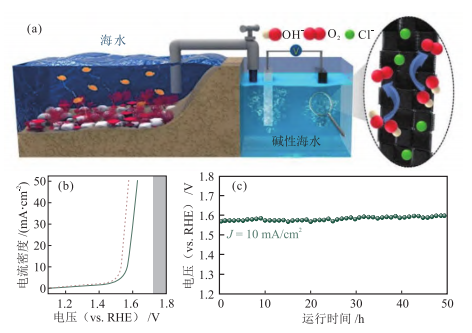 堿性海水電解制氫實(shí)驗(yàn)示意圖(a)、NCFPO/C@CC在電解海水中的極化曲線(b)和恒電位電解曲線(c)