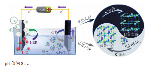 Fe[CN?]??輔助的普魯士藍(lán)/普魯士白氧化還原反應(yīng)應(yīng)用于直接海水電解制氫示意圖