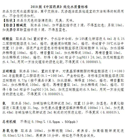 2010版中國(guó)藥典中明確指出,飲用水經(jīng)蒸餾法、離子交換法、反滲透法或其他方式制得的制藥用水,總有機(jī)碳檢測(cè)不得超過(guò)0.50mg/L(0.5ppm、500ppb)、不揮發(fā)物檢測(cè)遺留殘?jiān)坏眠^(guò)1mg、電導(dǎo)率(10℃,≤3.6µs/cm),(20℃,≤4.3µs/cm),(25℃,≤5.1µs/cm),細(xì)菌、霉菌和酵母菌總數(shù)每1ml不得過(guò)100個(gè)。