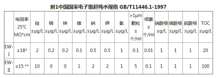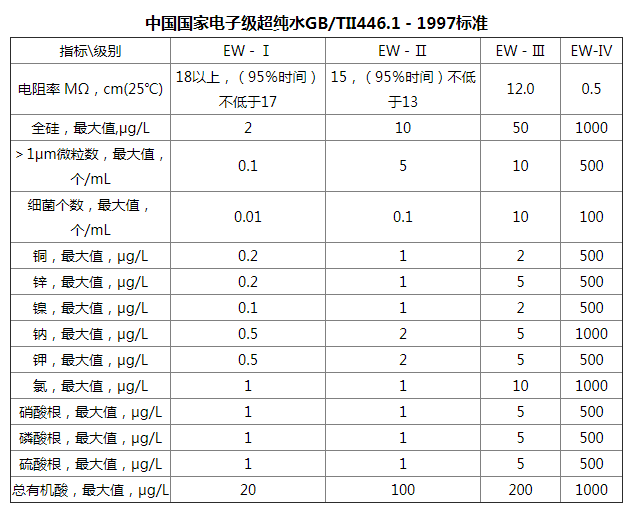 中國國家電子級超純水規(guī)格GB/TⅡ11446.1-1997標(biāo)準(zhǔn)