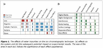 水污染的影響可能會產生嚴重的后果,并有可能使實驗結果無效。但是雜質對這種分析的可靠性和再現(xiàn)性究竟有什么影響呢?如圖1所示,離子、有機物、膠體、細菌和氣體、體的污染影響都會在一定程度上影響靈敏度和重現(xiàn)性。離子污染物往往具有顯著但短期的影響,產生化學干擾,直接降低結果并降低靈敏度。離子污染物水平的波動也會導致觀察結果的更大差異。盡管有機物、膠體和細菌也會影響背景/空白,但它們往往會通過介質污染和表面涂層產生長期影響,從而影響儀器的特定組件,例如色譜柱、檢測器和內部系統(tǒng)結構的表面。此類污垢的影響表現(xiàn)為異?;€偏移、基線上的未知峰、高噪聲等。