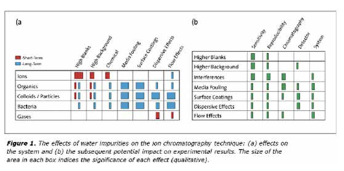 水污染的影響可能會產(chǎn)生嚴(yán)重的后果,并有可能使實(shí)驗(yàn)結(jié)果無效。但是雜質(zhì)對這種分析的可靠性和再現(xiàn)性究竟有什么影響呢?如圖1所示,離子、有機(jī)物、膠體、細(xì)菌和氣體的污染影響都會在一定程度上影響靈敏度和重現(xiàn)性。離子污染物往往具有顯著但短期的影響,產(chǎn)生化學(xué)干擾,直接降低結(jié)果并降低靈敏度。離子污染物水平的波動(dòng)也會導(dǎo)致觀察結(jié)果的更大差異。