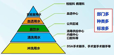 其實在醫(yī)療機構(gòu)中需要用到純水的部門有多達10余個部門,其中可以根據(jù)用水需求來進行劃分一共分為5個等級6個種類。