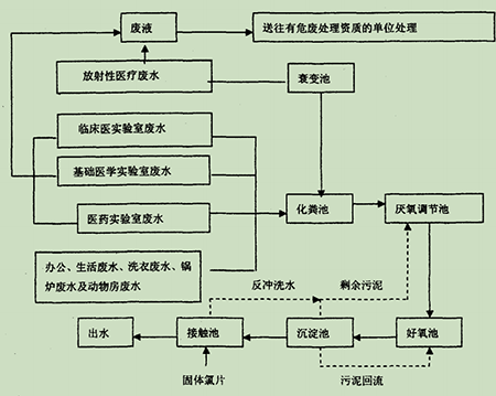 經實驗室前端進行廢水的分類處理,再根據廢水廢液的可回收性、危險性交付有資質的單位進行處理,余下的實驗室廢水可通過實驗室前處理后經由排水管道進入化糞池,廢水進入化糞池與生活污水進行混合后,進入厭氧調節(jié)池進行水解酸化處理,由于生活污水可以起到稀釋降解有機物的作用,可以改善一些難降解性的有機物。