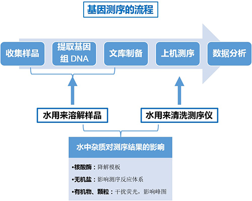 整個測序環(huán)節(jié)中,從樣品收集到上機測序,水貫穿了包括測序儀的日常清洗維護和試劑配制在內(nèi)的每一個環(huán)節(jié)。作為一個必不可少的基礎(chǔ)試劑,水的品質(zhì)對最終測序結(jié)果會產(chǎn)生顯著影響。水中的雜質(zhì),如無機鹽、有機物、核酸酶、顆粒物等,不僅會污染設(shè)備,縮短測序儀毛細管的使用壽命,而且還會降低DNA聚合酶的活性,最終干擾測序結(jié)果的準(zhǔn)確性。
