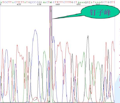 “釘子峰”是A、T、C、G四個顏色的峰都被突然拔起,形成的尖銳峰形。