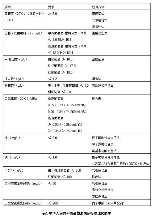 中國在2006年參考上述OIV標準推出了《中華人民共和國葡萄酒國家標準》(GB/T 15037-2006)。該標準規(guī)定了葡萄酒的定義、分類、要求和分析方法等內(nèi)容。在要求中的“理化要求”中,標準對表1所述的項目提出了限制: